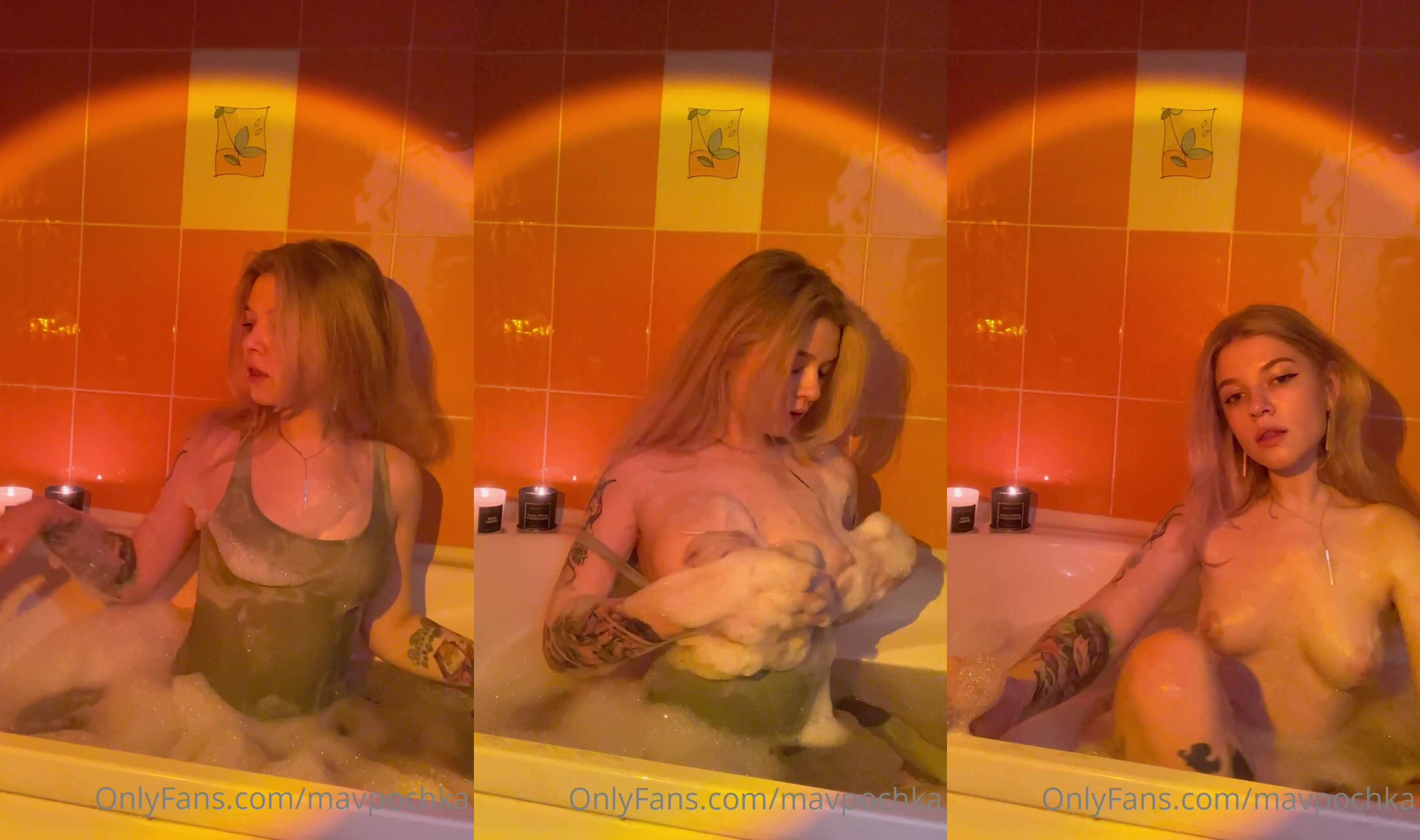 OnlyFans Blonde Mavpochka Soaping Her Curvy Body in a Bubble Bath Video.