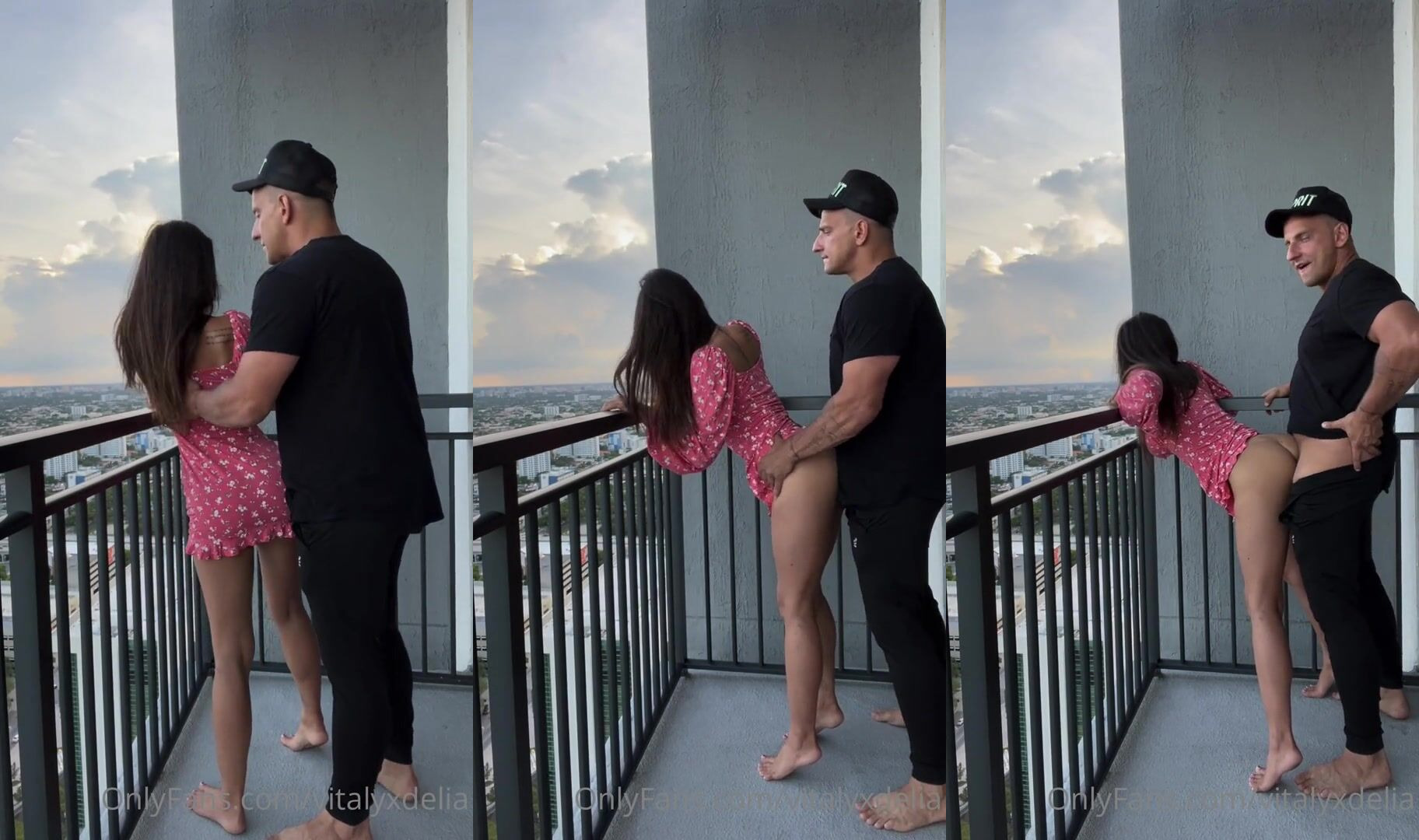 Fit babe Delia Rose enjoys public balcony sex in a pink dress in this leaked OnlyFans video.